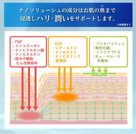 ナノセリューシュは、有効成分であるヒト幹細胞培養液をはじめとした4つのエイジングケア成分などをナノレベルまで小さくし、お肌の深層である角質層まで届けます。