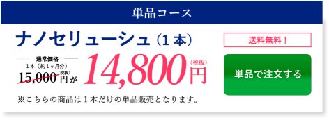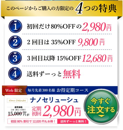 ナノセリューシュは、通常価格が15,000円(税抜)なのですが、このコースでは、1回目が2,980円(税抜)、2回目は9,800円(税抜)、3回目以降は12,680円(税抜)です。このコースは、ずーっと割引価格で購入できるのと、ずーっと送料が無料になるのが特徴です。