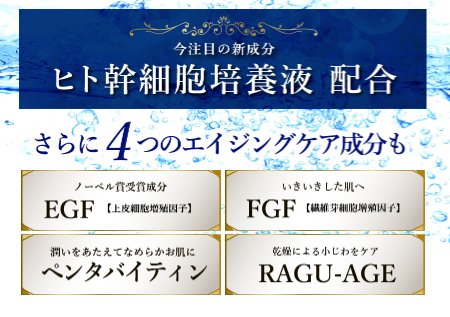 注目のヒト幹細胞培養液の他、4つのエイジングケア成分、7つの美容成分を、お肌の角質層まで浸透させ、お肌の乾燥と小ジワのケアにより潤いのあるぷるるん肌をとりもどします。