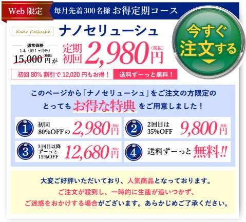 ナノセリューシュを試す3ヶ月に必要な金額は、通常なら15,000円×3ヶ月×消費税(1.08)となって、48,600円です。しかし、毎月先着300名様お得定期コースなら、3ヶ月で27,497円と43%近くの値引きとなっています。しかも、送料がかかりません。